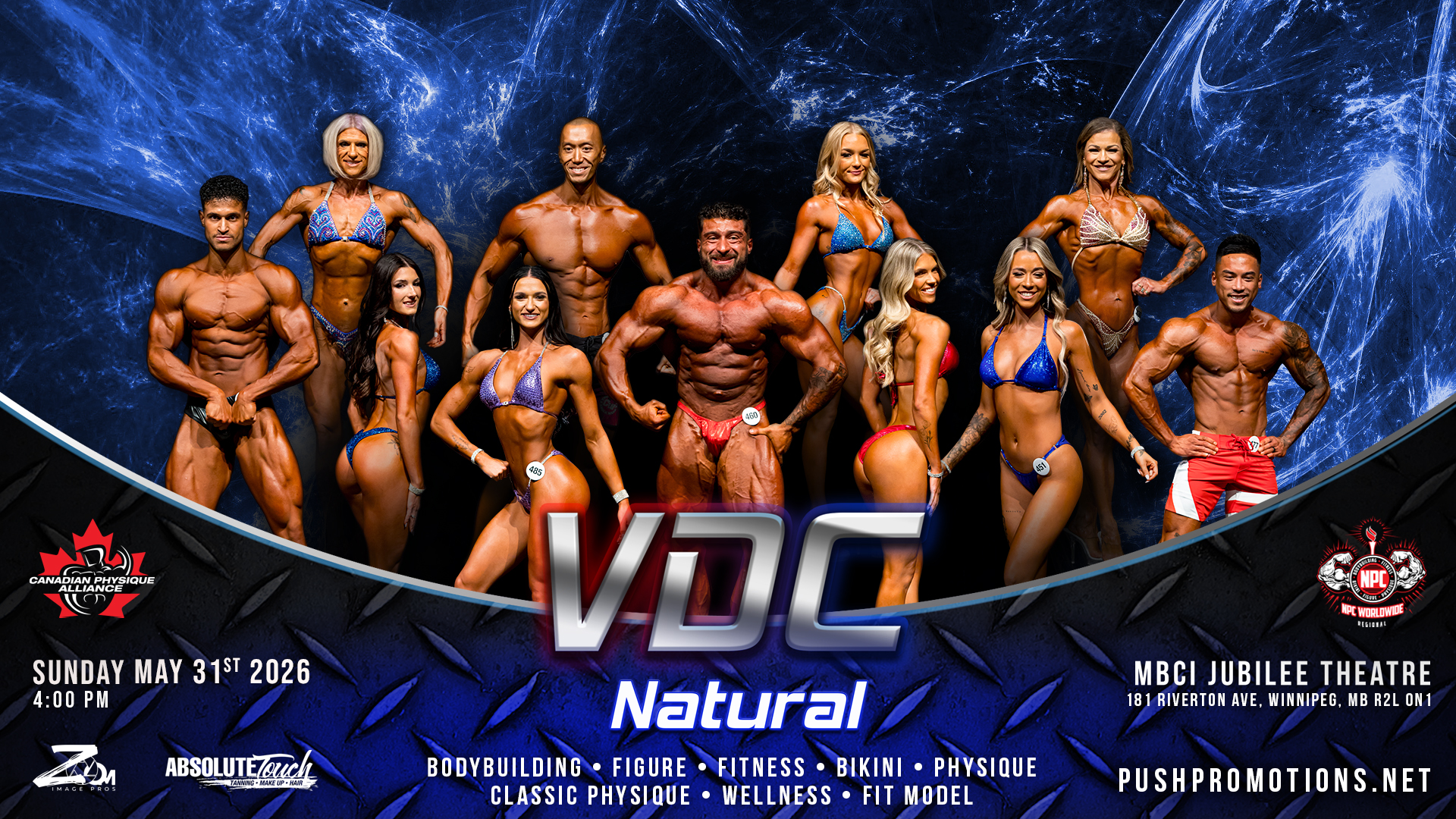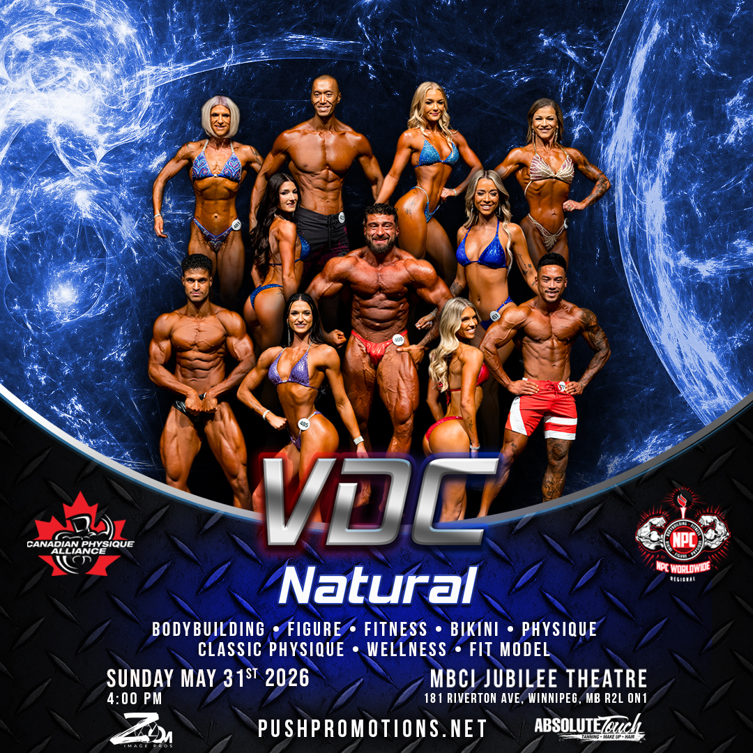 Welcome to the VDC Natural! Winnipeg’s ONLY natural regional event, sanctioned event by the CPA / NPC Worldwide. Starting its debut in 2019, the VDC Natural qualifies the TOP 3 placed athletes at the Regional level to move on to the Canadian Natural Nationals and further advance to becoming an IFBB Pro of the IFBB Pro League. All Natural athletes are subject to random anti-doping tests the day of the event by third party urine testing.